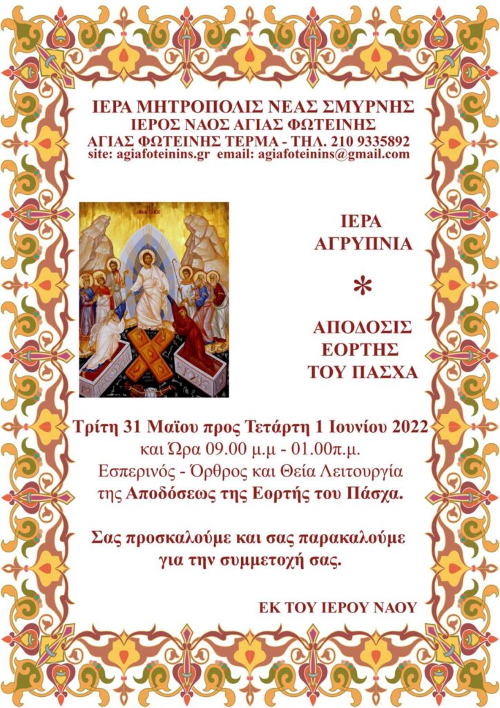 ΤΗΝ ΤΡΙΤΗ. ΙΕΡΑ ΑΓΡΥΠΝΙΑ ΑΠΟΔΟΣΗΣ ΤΟΥ ΠΑΣΧΑ 20 Μαΐου 2023 συντάκτης ΣΑΒΒΑΣ ΠΑΠΑΔΟΠΟΥΛΟΣ · Published 20 Μαΐου 2023 · Last modified 25 Μαΐου 2023