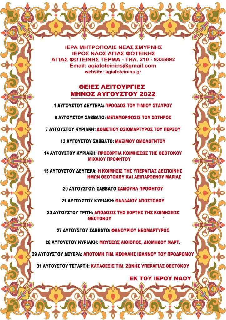 ΩΡΑΡΙΟ ΝΑΟΥ ΑΥΓΟΥΣΤΟΥ 31 Ιουλίου 2022 συντάκτης ΣΑΒΒΑΣ ΠΑΠΑΔΟΠΟΥΛΟΣ · Published 31 Ιουλίου 2022 · Last modified 4 Φεβρουαρίου 2023