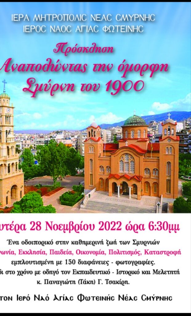 Ένα οδοιπορικό στη καθημερινή ζωή των Σμυρνιών- Κοινωνία, Εκκλησία, Παιδεία, Οικονομία, Πολιτισμός, Καταστροφή- εμπλουτισμένη με 150 διαφάνειες-φωτογραφίες. Ταξίδι στον χρόνο με οδηγό τον Εκπαιδευτικό-Ιστορικό και Μελετητή κ.Παναγιώτη Τσακίρη.