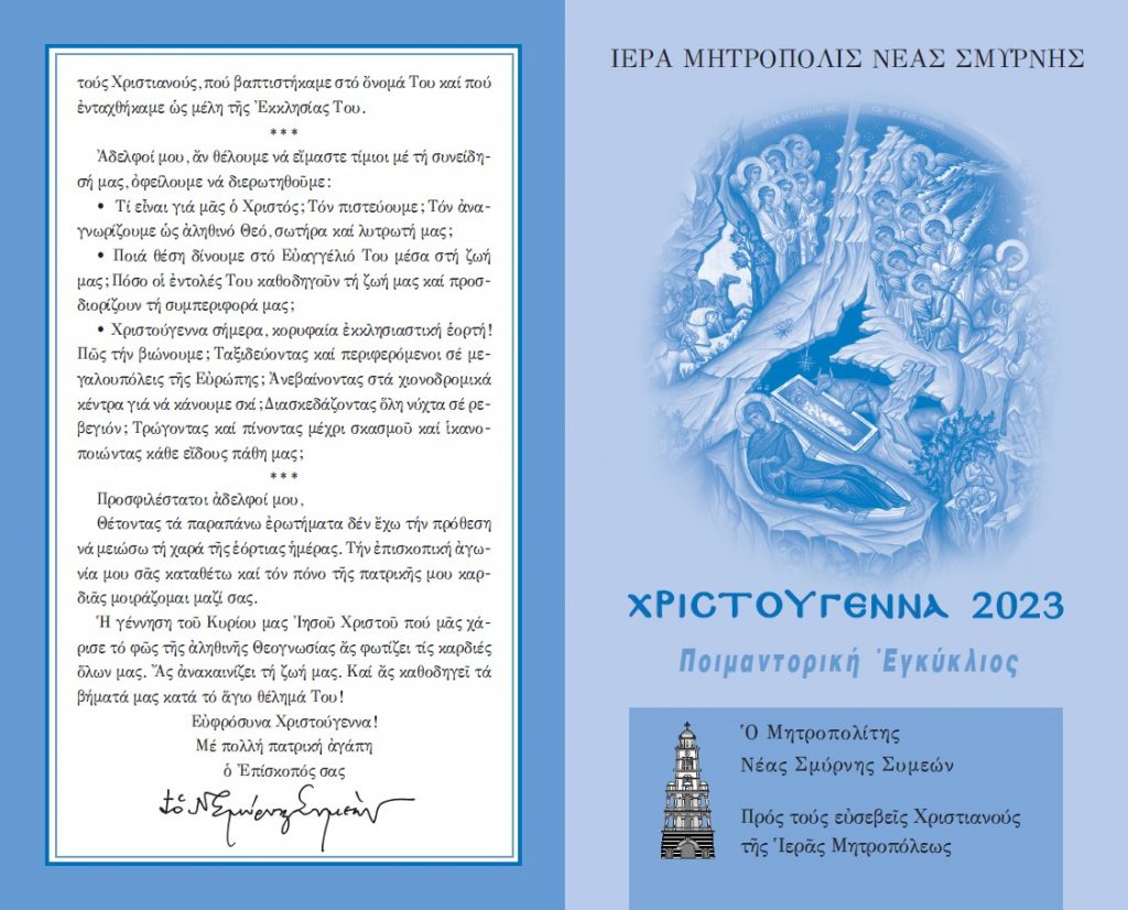 Χριστούγεννα καί πάλι σήμερα! Κορυφαία ἑορτή τῆς Χριστιανοσύνης. Ἐπέτειος τῆς κατά σάρκα γεννήσεως τοῦ Θεανθρώπου Κυρίου μας. Ἡ εἴσοδος τοῦ Μονογενοῦς Υἱοῦ καί Λόγου τοῦ Θεοῦ στά μονοπάτια τῆς ἀνθρώπινης ἱστορίας. Ἡ ἀποκάλυψη τῆς ἄπειρης ἀγάπης τοῦ Τριαδικοῦ Θεοῦ μας σέ ὅλους ἐμᾶς τά λογικά πλάσματά Του. Ἡ ἀπαρχή τῆς θείας Οἰκονομίας γιά τή σωτηρία τοῦ γένους μας.