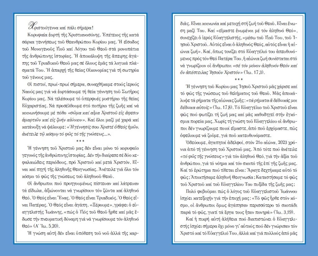 Ὁδεύουμε, ἀγαπητοί ἀδελφοί, στόν 21ο αἰώνα, 2023 χρόνια ἀπό τή γέννηση τοῦ Χριστοῦ μας. Ἀπό τότε πού ἀνέτειλε «τό φῶς τῆς γνώσεως» γιά τόν ἀληθινό Θεό, γιά τήν ἀξία τοῦ ἀνθρώπου, γιά τό νόημα καί τόν σκοπό τῆς ἐπί γῆς ζωῆς μας. Καί τό ἐρώτημα πού τίθεται εἶναι: Ἄραγε δεχτήκαμε αὐτό τό φῶς; Ἀποκτήσαμε ἀληθινή Θεογνωσία; Καταστήσαμε τό φῶς τοῦ Χριστοῦ καί τοῦ Εὐαγγελίου Του πυξίδα τῆς ζωῆς μας;