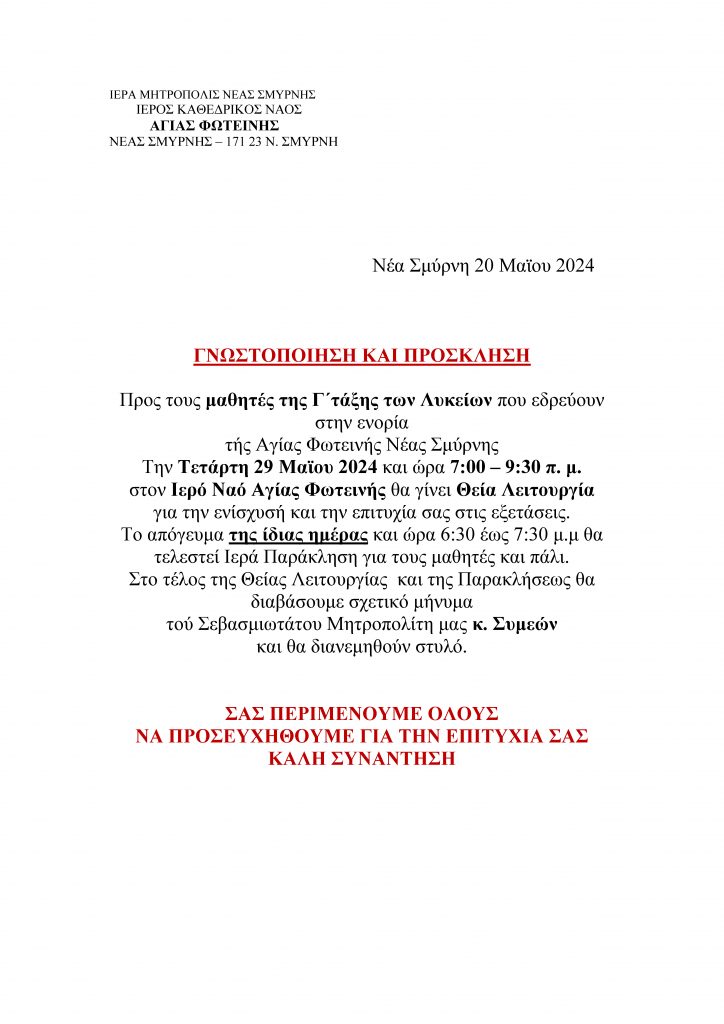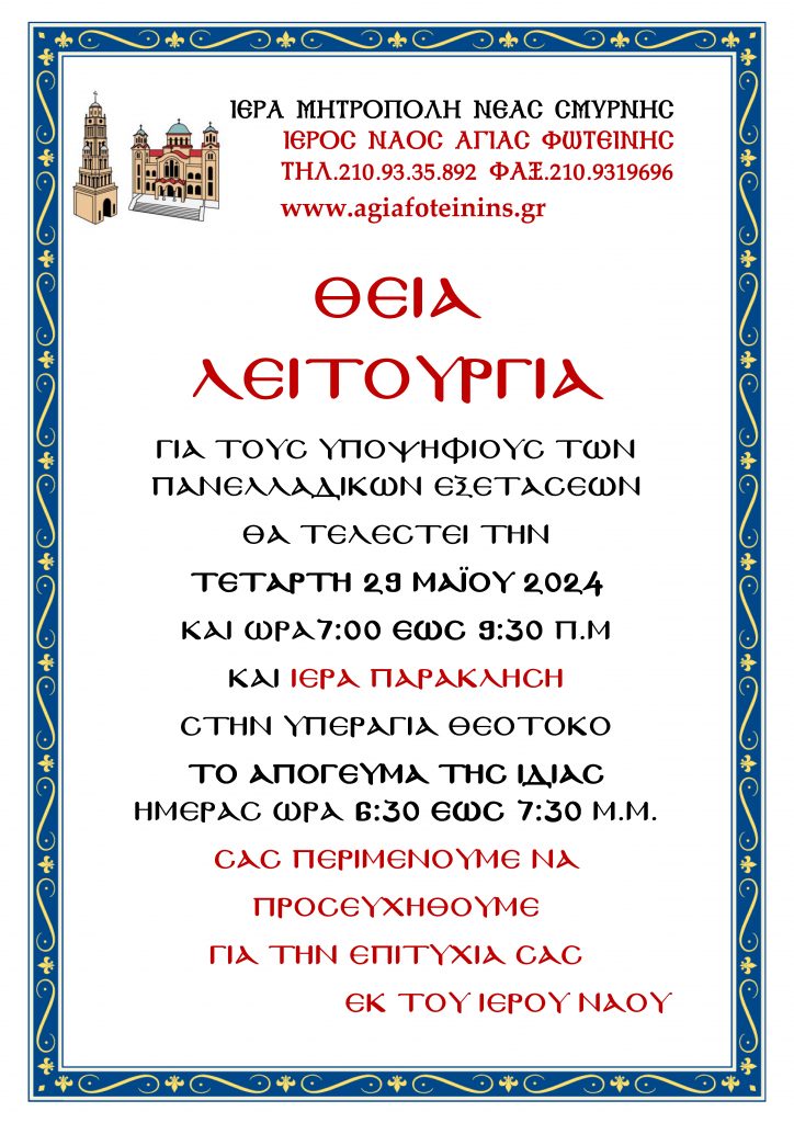 Ἑτοιμάζεστε ἤδη γιά τίς Πανελλαδικές Ἐξετάσεις. Γεγονός πού, χωρίς ἀμφιβολία, ἀποτελεῖ ἕναν ἀπό τούς σημαντικότερους σταθμούς στή ζωή σας. Ὡς πνευματικοί σας πατέρες νά ξέρετε πώς συμμεριζόμαστε κι ἐμεῖς τήν ἀγωνία τόσο τή δική σας, ὅσο καί τῶν οἰκογενειῶν σας. Γι᾽ αὐτό καί σᾶς προσκαλέσαμε σήμερα ἐδῶ, στόν Ἱερό Ναό τῆς Ἐνορίας σας. Γιά νά προσευχηθοῦμε καί νά παρακαλέσουμε ὅλοι μαζί ὁ ἀναστημένος Κύριός μας Ἰησοῦς Χριστός: