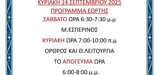 Ὁ Ἱερός Ναός, γιά τό μήνα ΣΕΠΤΕΜΒΡΙΟ θα είναι ἀνοικτός τίς ἑξῆς ὧρες: