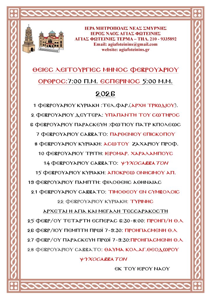 ΩΡΑΡΙΟ ΝΑΟΥ ΦΕΒΡΟΥΑΡΙΟΥ 2 Φεβρουαρίου 2026 συντάκτης ΑΝΑΣΤΑΣΙΟΣ ΣΤΑΜΑΤΙΟΥ · Published 2 Φεβρουαρίου 2026 · Last modified 7 Φεβρουαρίου 2026