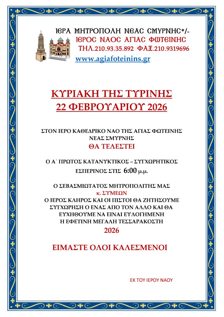 | 22 | Φεβρουαρίου | Τυρινῆς | Ἁγία Φωτεινή Νέας Σμύρνης |